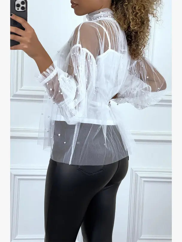 ✨ Chemisier en tulle transparent perlé — Élégance aérienne et allure moderne ✨