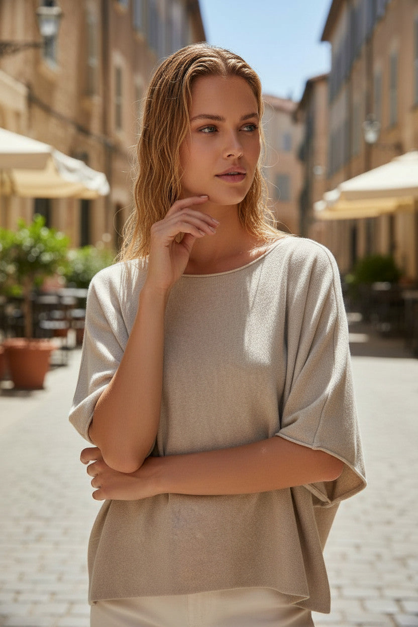 Ce pull fluide à manches courtes séduit par sa coupe ample et sa texture subtilement gaufrée. Son encolure bateau apporte une touche de délicatesse, tandis que sa matière ultra douce offre un confort irrésistible. Disponible en rose poudré ou en beige lumineux, c’est un essentiel chic à glisser dans toutes les garde-robes d’automne.