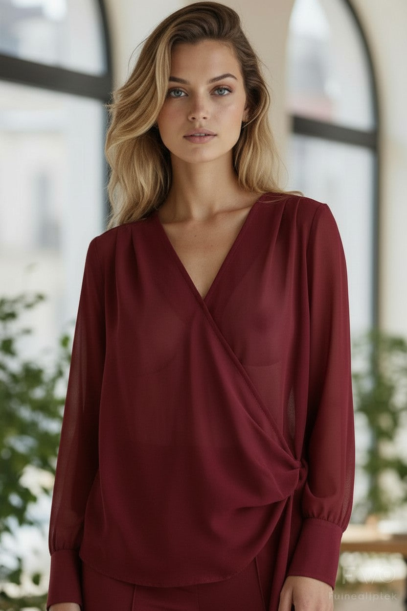 Blouse fluide à col croisé, manches longues semi-transparentes