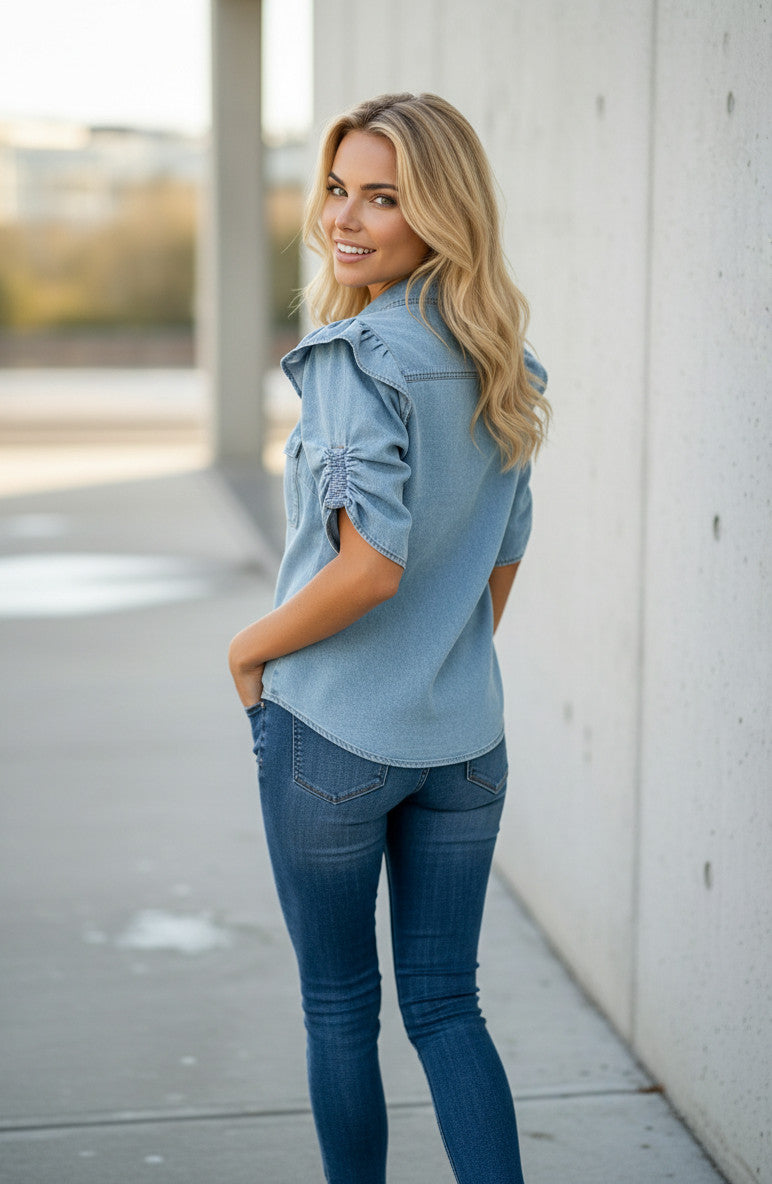Les volants ajoutent une touche féminine à cette chemise en jean pour femme.