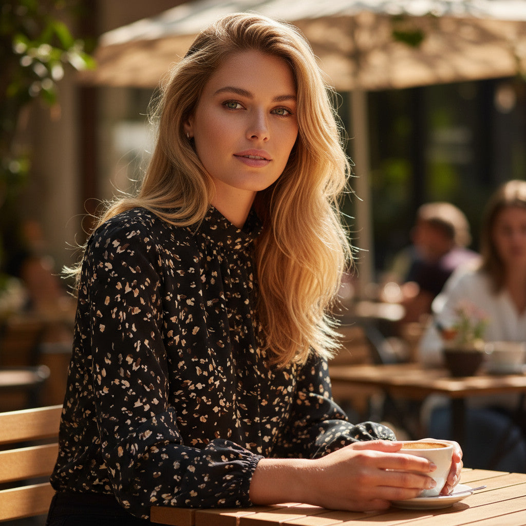 This blouse is a strong piece, thought for daring women who want to express their personality with elegance. Its black leopard print brings a wild and sophisticated touch, ideal for sublimate a day and night look. The upright collar adds an elegant structure to the silhouette, emphasizing the head port with refinement. The lantern sleeves bring volume in lightness, creating a delicate contrast with the pleated lines of the fabric. The pleated details are not only aesthetic: they subtly underline the forms without constraining them, for optimal comfort and a fluid fall. This blouse can be worn as well in high -waisted pants for a chic look, as with jeans for a more relaxed but always refined style.