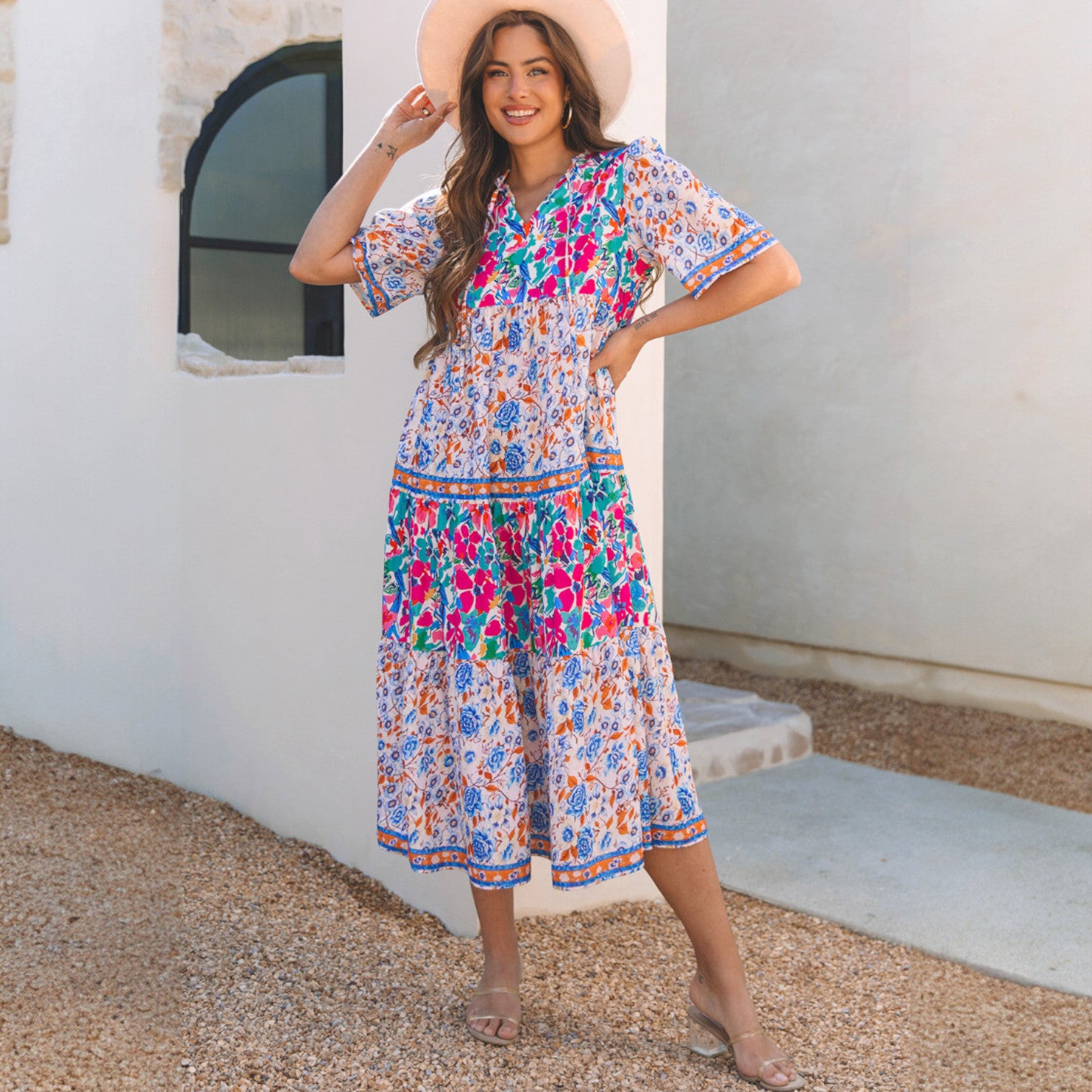 La vie en pleine floraison avec cette jolie robe longue ! Tissu léger avec des panneaux de différents imprimés floraux colorés.Un décolleté en V avec un détail noué pour une fermeture supplémentaire.Des manches courtes et amples et une silhouette décontractée se terminent par une longueur mi-mollet.