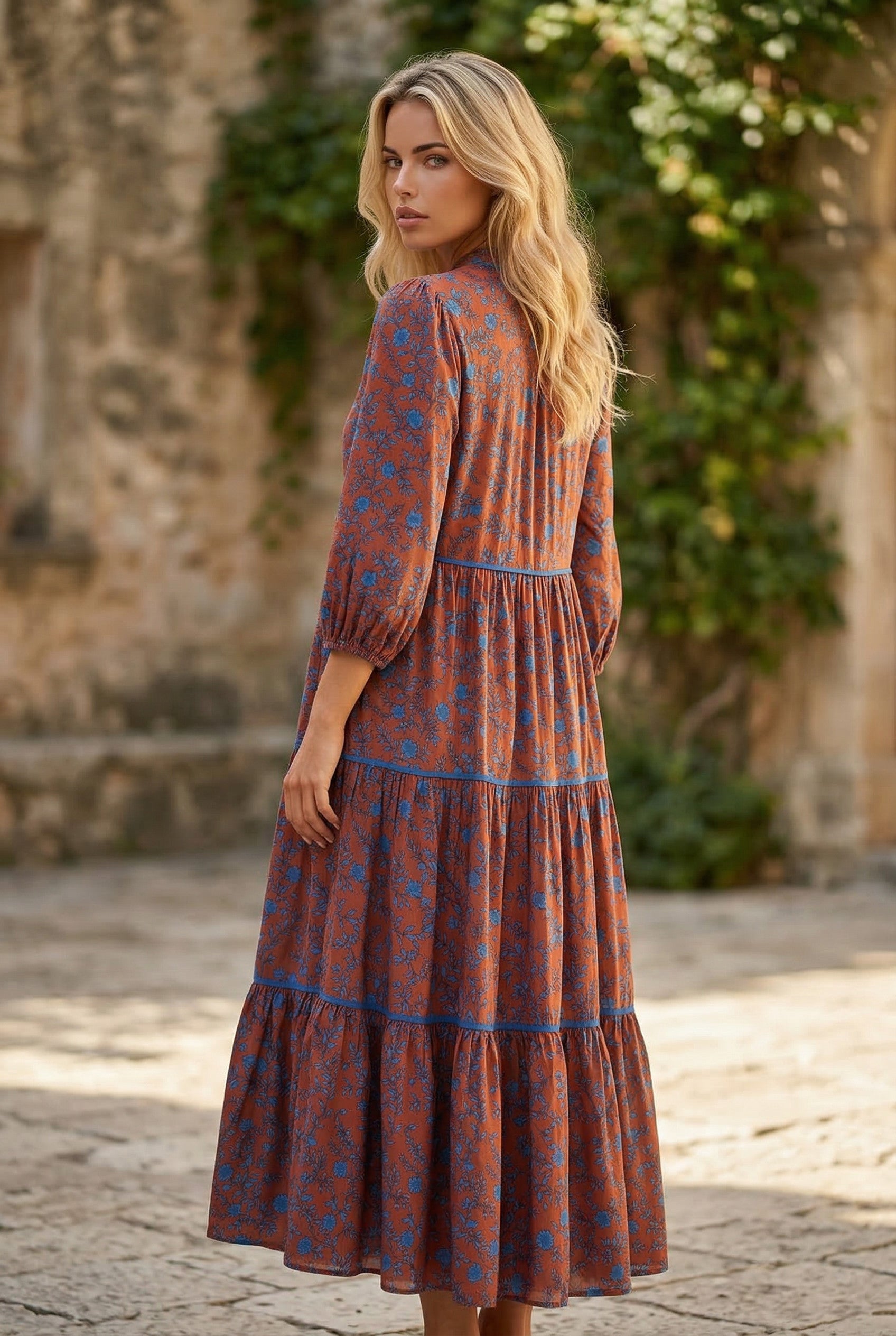 Cette robe longue décontractée présente un décolleté en V ludique et des manches bouffantes 3/4.