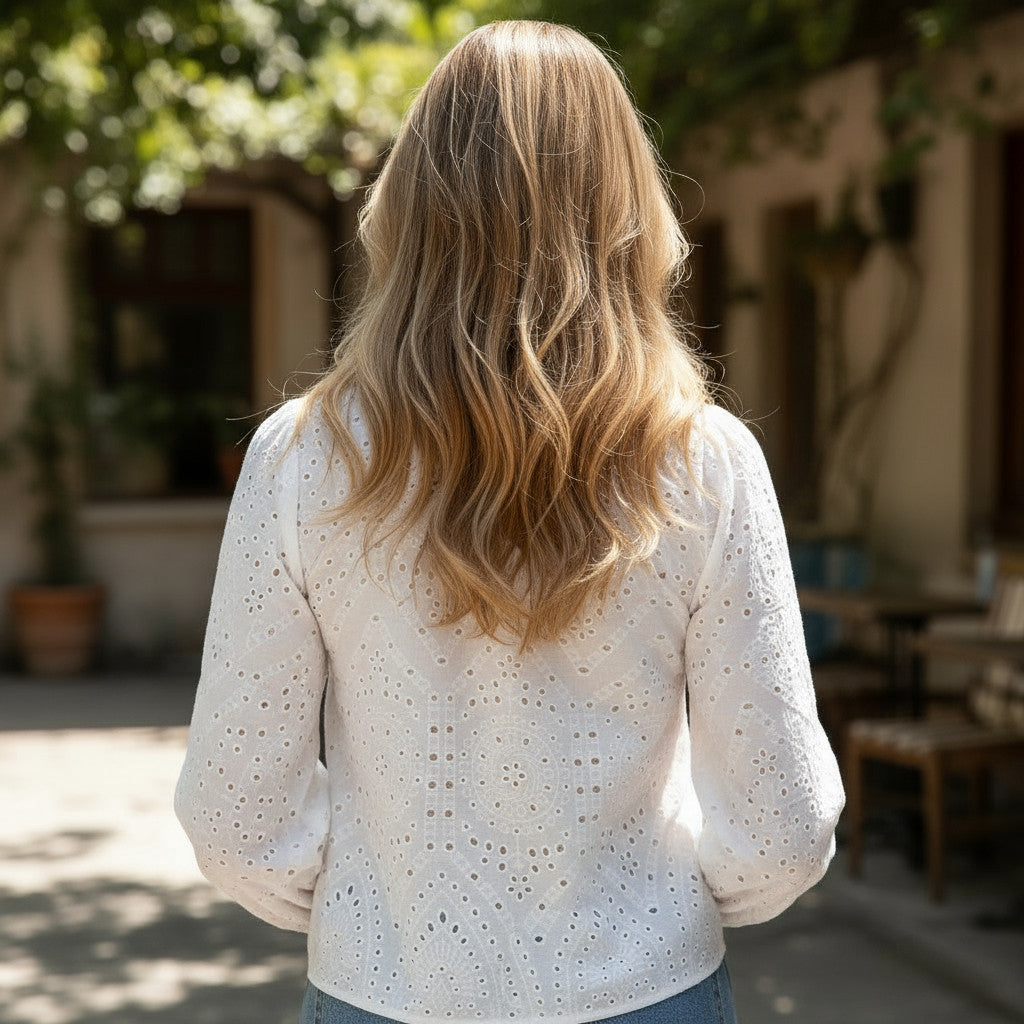 Embroidered blouse with eyelets and puffy sleeves - refined elegance and assured femininity