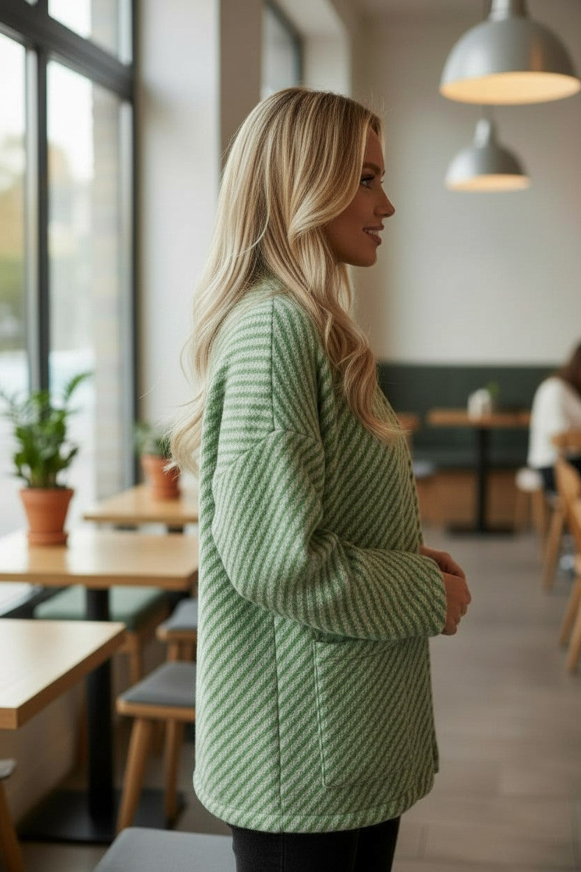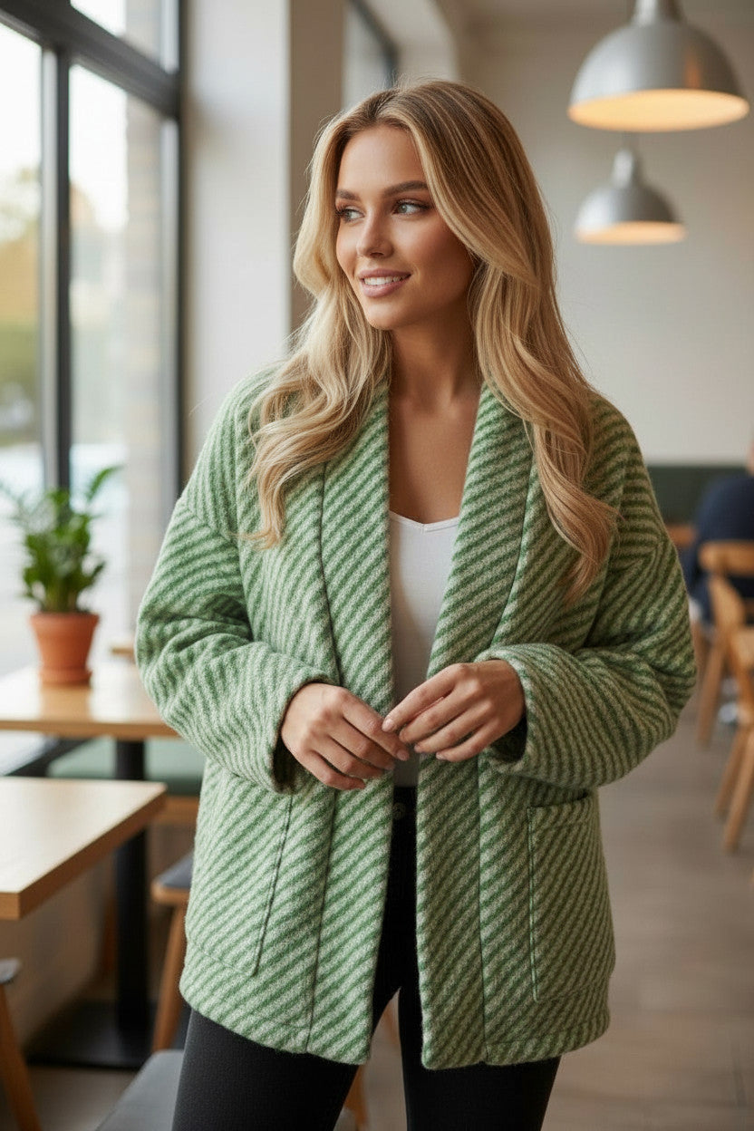Quand l’élégance rencontre le confort, cela donne cette veste rayée à la coupe fluide et ouverte. Avec sa matière chaude et douce, et ses poches pratiques, elle est idéale pour affronter les journées fraîches tout en style. Un incontournable de saison décliné en deux teintes irrésistibles.