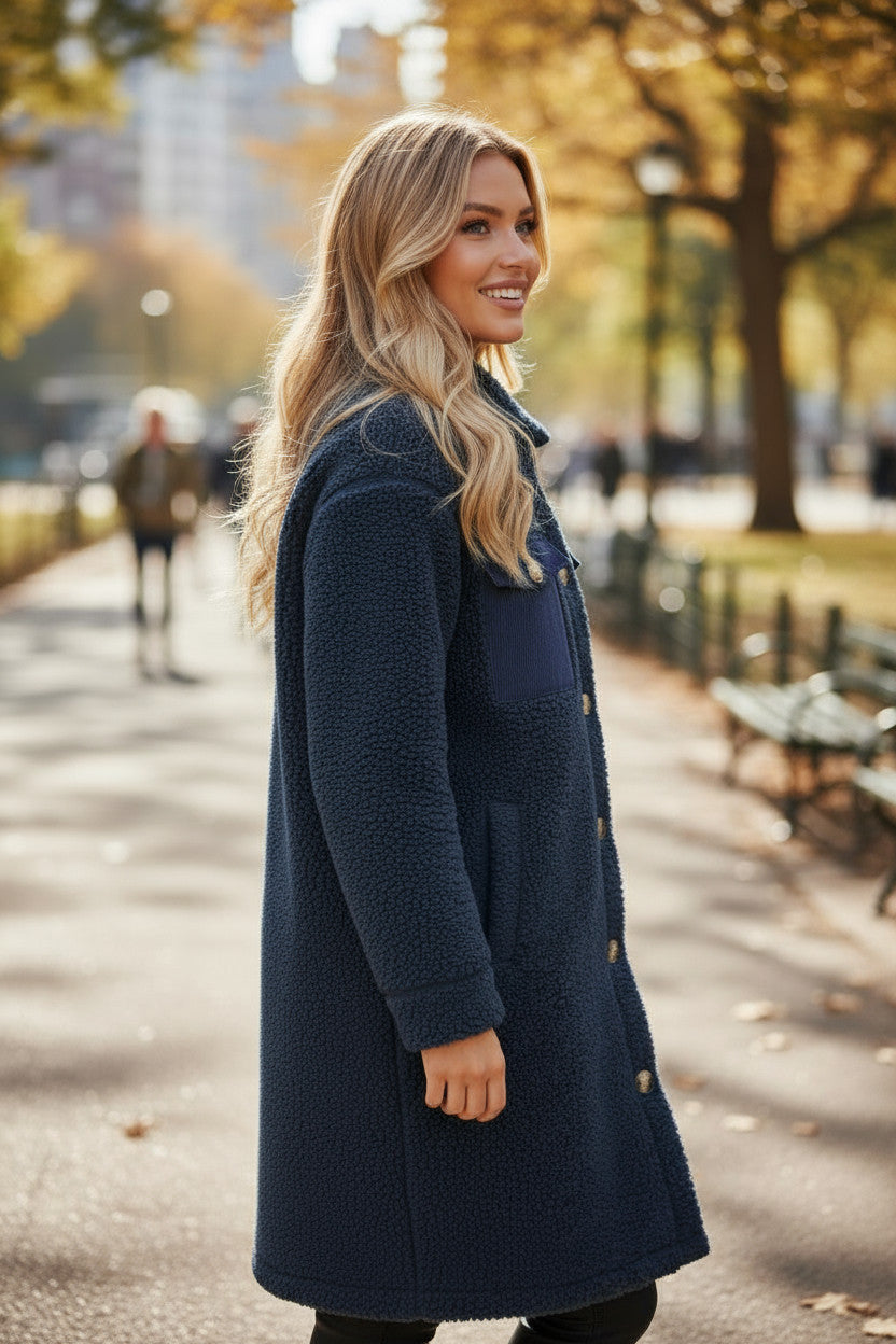 El largo abrigo de peluche es una opción elegante y cómoda para el invierno.