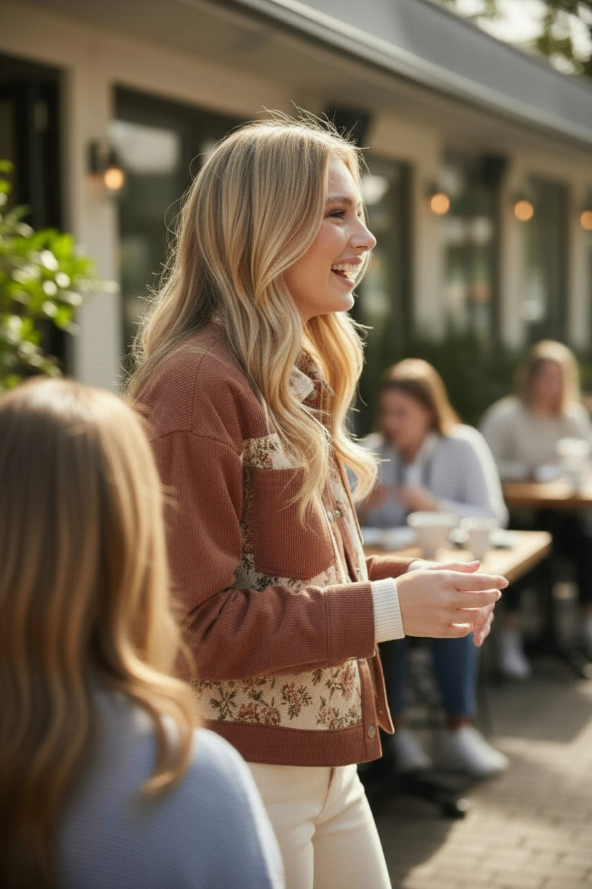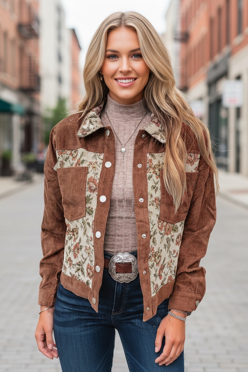 Affirmez votre style avec cette surchemise à patchwork floral rétro, parfaite pour apporter une touche vintage à vos tenues du quotidien. Son motif floral multicolore évoque l’esprit des années 70, tandis que la texture côtelée ajoute du relief et une sensation de douceur au porté.