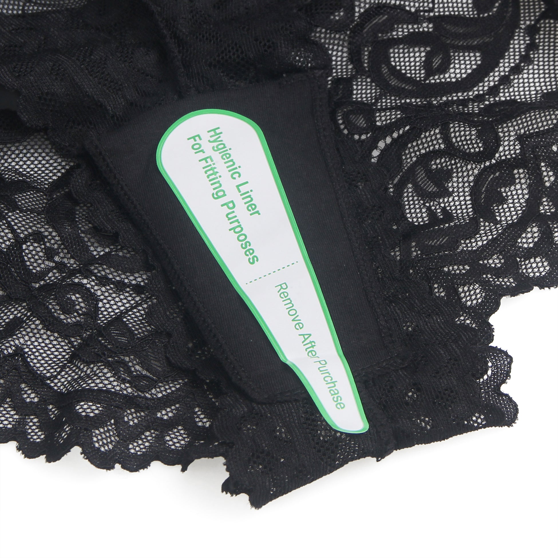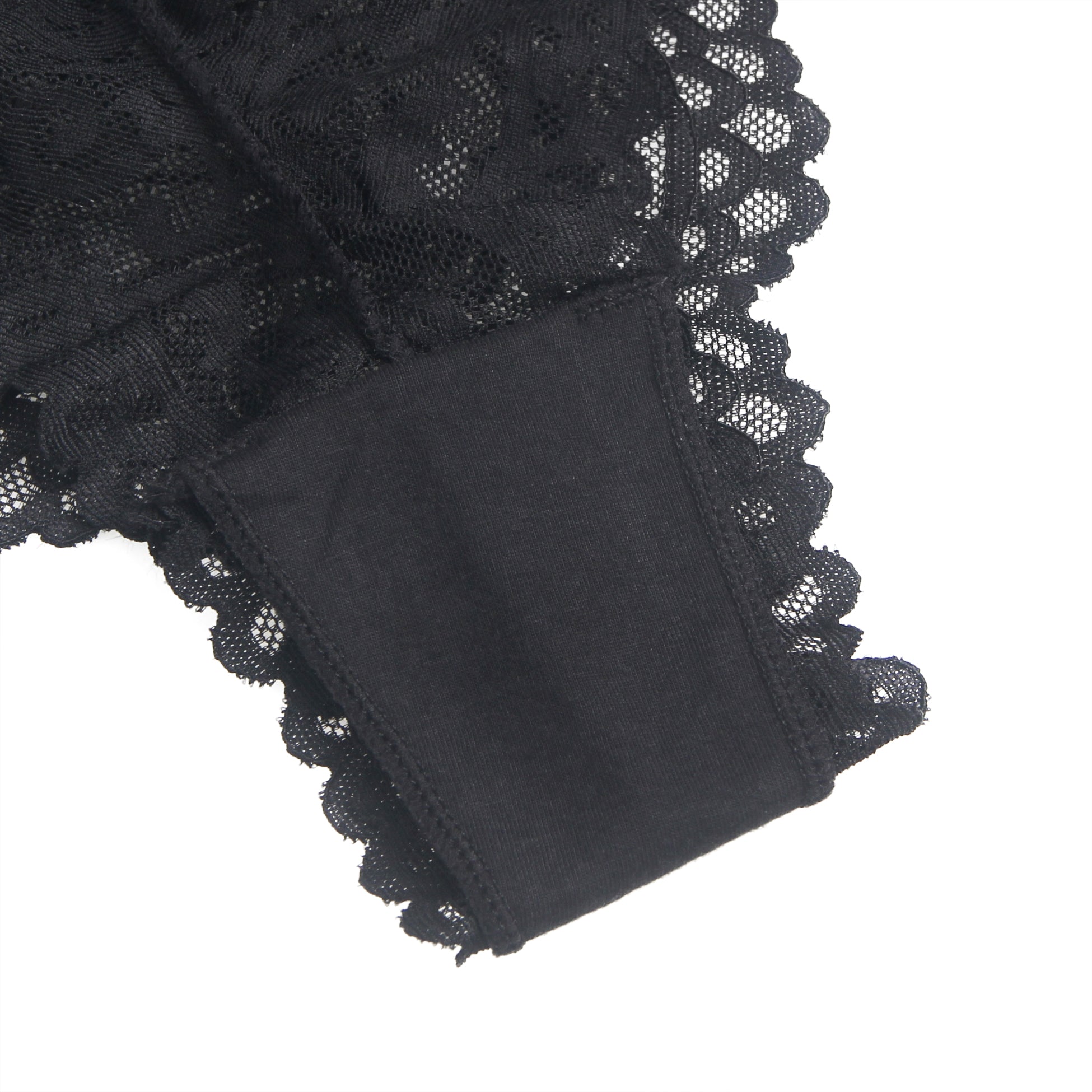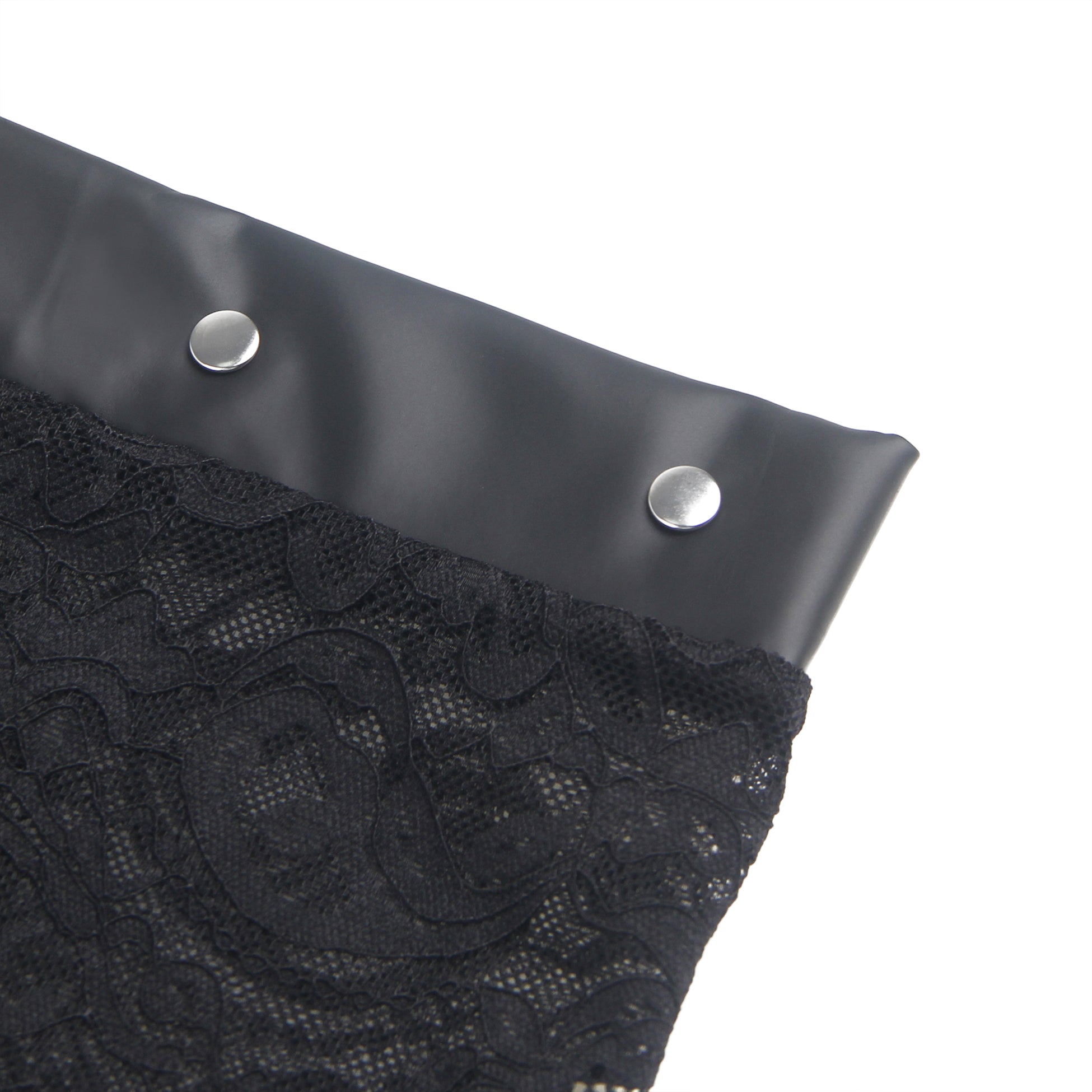 Culotte taille haute en dentelle florale extensible. Ceinture en similicuir noir décorée de rivets métalliques. Dos échancré façon "cheeky". Gousset doublé avec protection hygiénique.