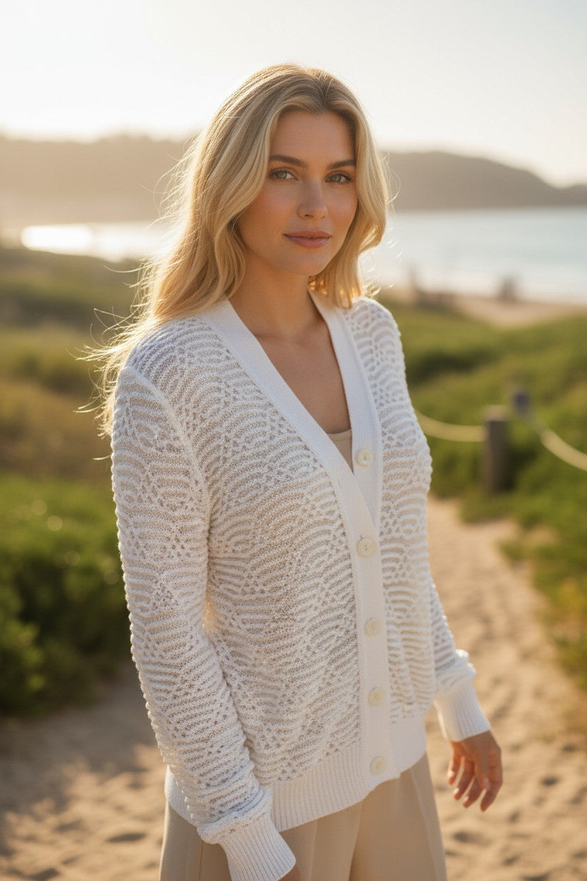 Ce gilet ajouré blanc est une pièce délicate et raffinée à avoir dans toute garde-robe féminine. Son tricot fin et ajouré dessine de jolis motifs ondulés, parfaits pour une touche de romantisme tout en légèreté. La coupe droite et les finitions côtelées lui donnent une allure moderne, facile à associer avec un jean, une jupe ou une robe fluide.