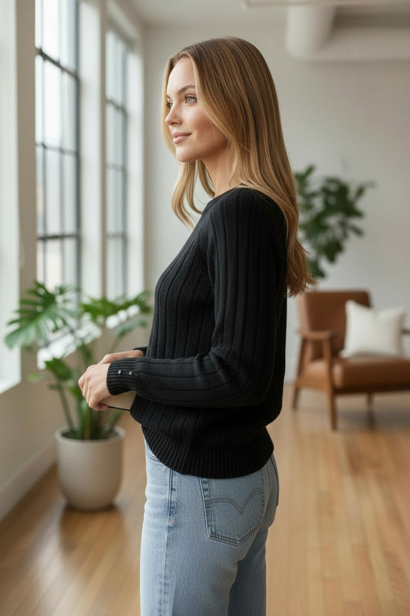 💫 Élégance Sculptée – Pull côtelé à col rond en maille souple