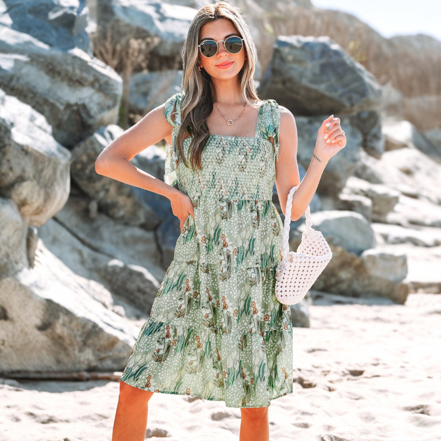 Démarquez-vous avec style grâce à l'imprimé floral vibrant, ajoutant une touche de couleur et de charme.Flattez votre silhouette avec le panneau smocké chic, accentuant magnifiquement vos courbes.Adoptez une ambiance ludique et féminine avec les niveaux de volants en cascade.
