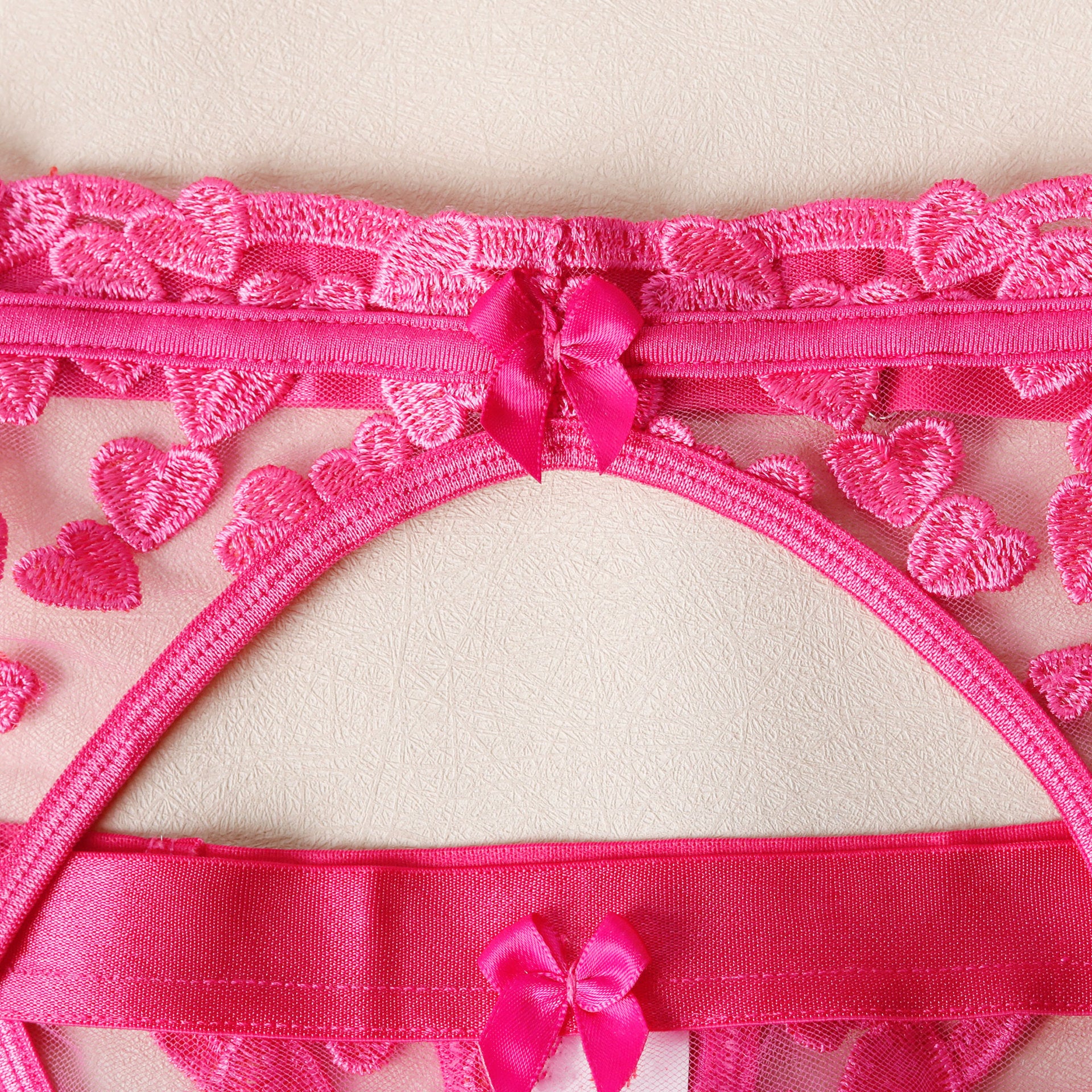 Romantique, espiègle et envoûtant, l’ensemble « Douce Promesse » est un hymne à la féminité. Sa broderie cœur en rose fuchsia sur tulle transparent joue la carte de la séduction, tandis que sa coupe taille haute galbe parfaitement la silhouette. Le soutien-gorge à armatures offre un maintien élégant, complété par une ceinture jarretelle sensuelle et un string ultra-féminin. Un bijou de lingerie pour sublimer vos instants précieux.