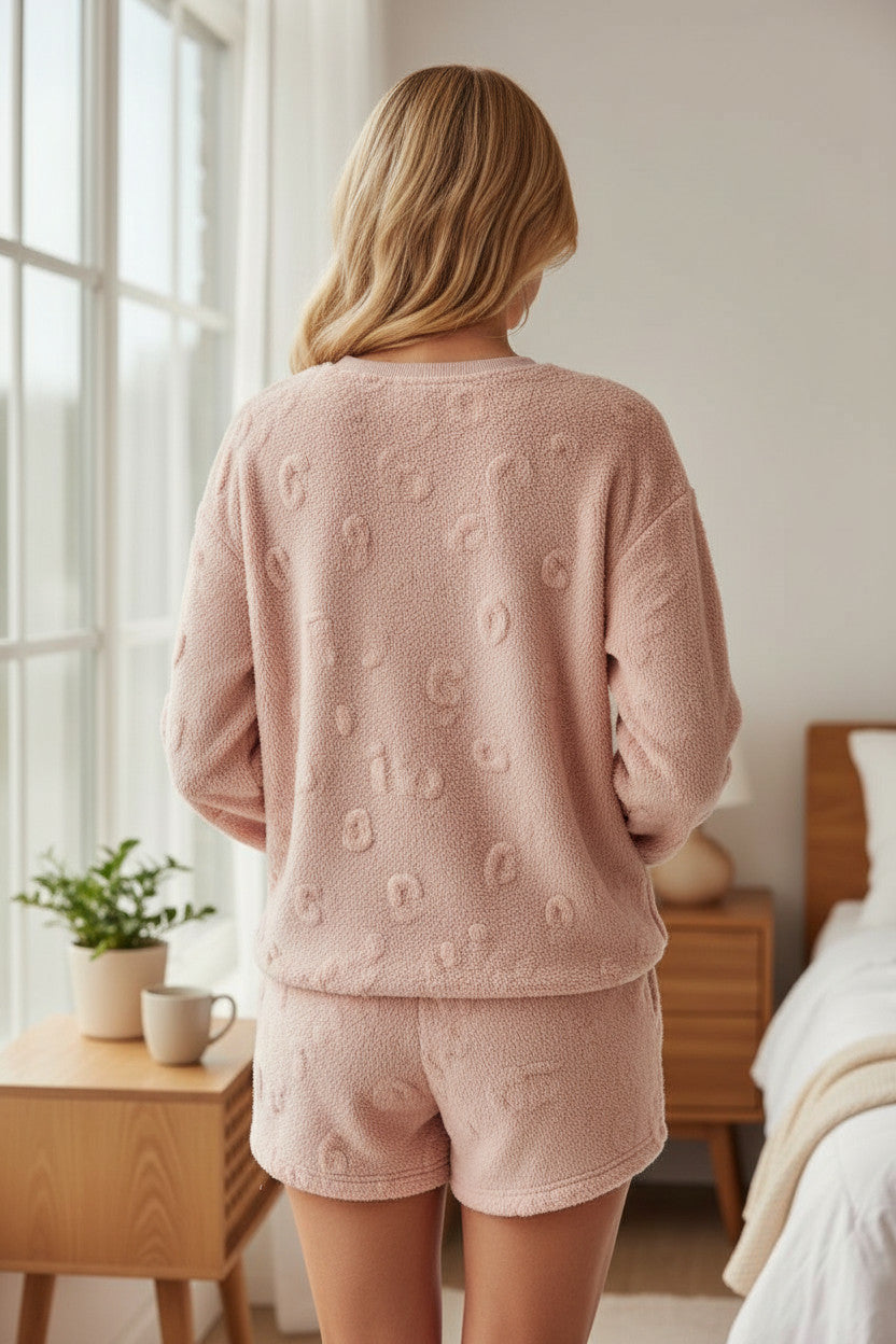 Restez au chaud tout en affirmant votre style avec cet ensemble de détente en polaire à imprimé léopard. Conçu pour vous envelopper de douceur, il combine une texture luxueuse et un imprimé férocement tendance. Son haut à manches longues et son short assorti en font un ensemble polyvalent, idéal pour toutes les saisons.