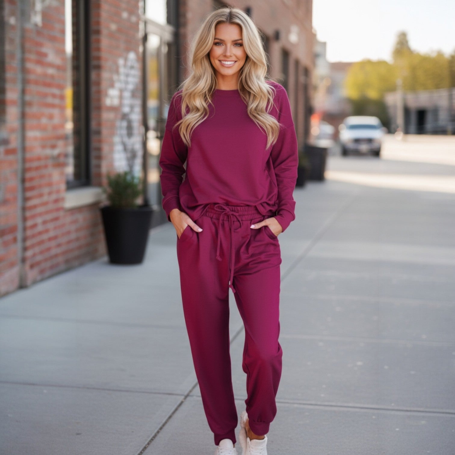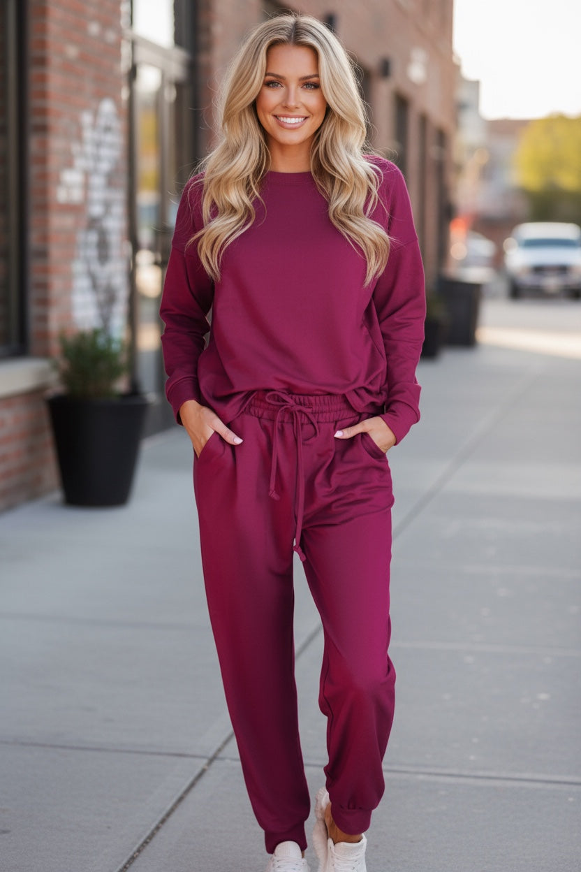 Composé d’un pull à encolure ras-du-cou et d’un pantalon de jogging à taille ajustable, cet ensemble en tricot moelleux est idéal pour rester chic à la maison, en télétravail ou pour vos sorties décontractées.