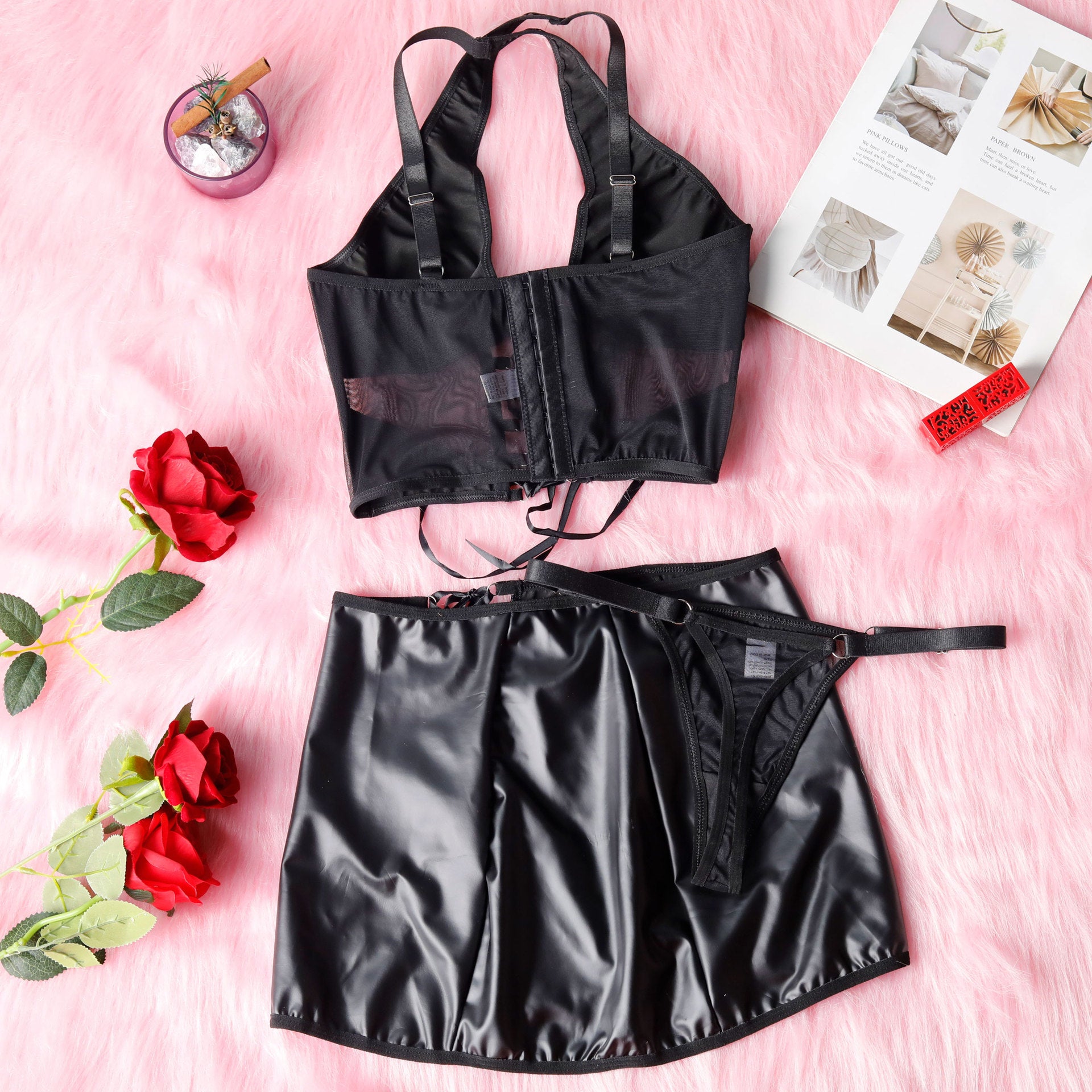 Un design qui allie audace et séduction ! Cet ensemble noir brillant met en valeur chaque courbe avec un jeu de laçages suggestifs, un tissu effet vinyle lisse et des empiècements en tulle transparent. Le haut croisé à décolleté goutte dévoile subtilement la poitrine, tandis que la mini-jupe fendue, lacée sur les hanches, offre un look aussi sexy que stylé. Un ensemble parfait pour faire monter la température.