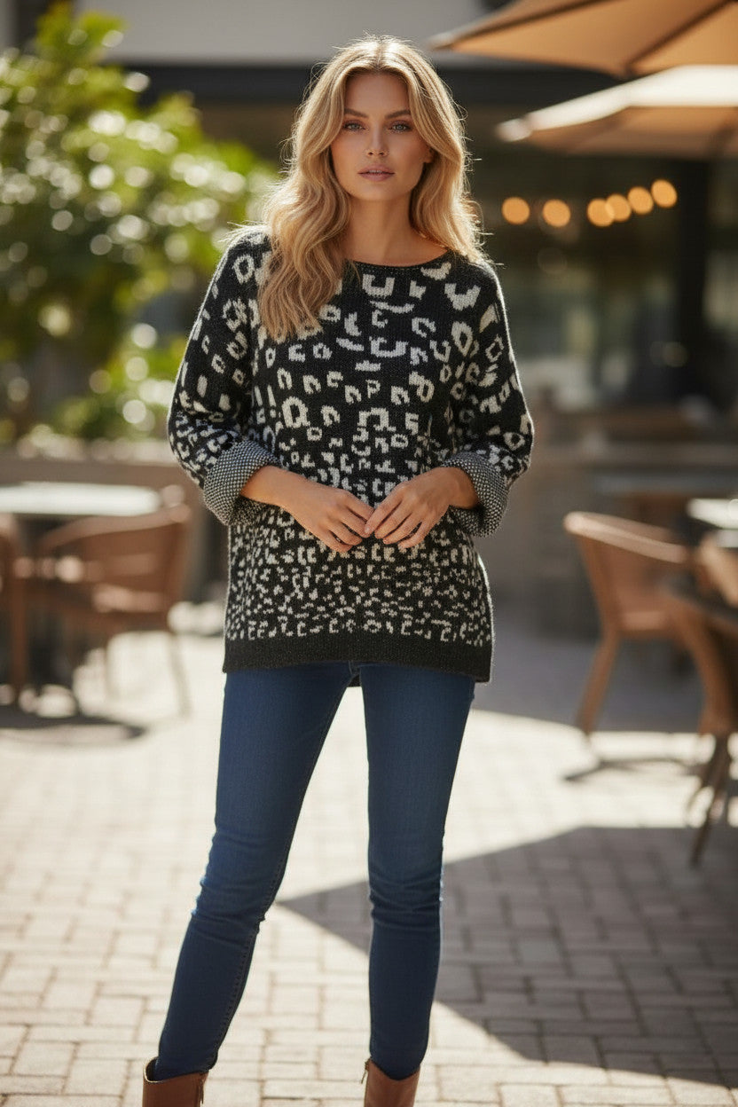 Exprimez votre audace avec ce pull à motif animalier noir et écru. Sa maille chaude et sa coupe confortable en font un indispensable de l’hiver, à la fois original et facile à porter. Le revers de manches contrasté ajoute une touche d’élégance inattendue.