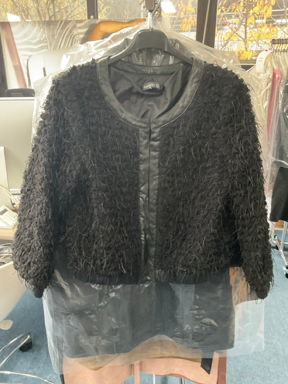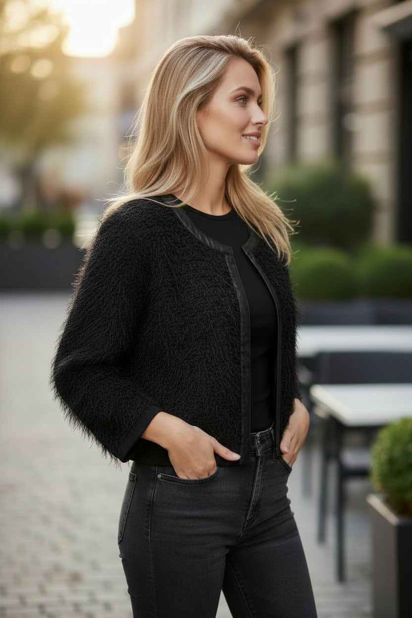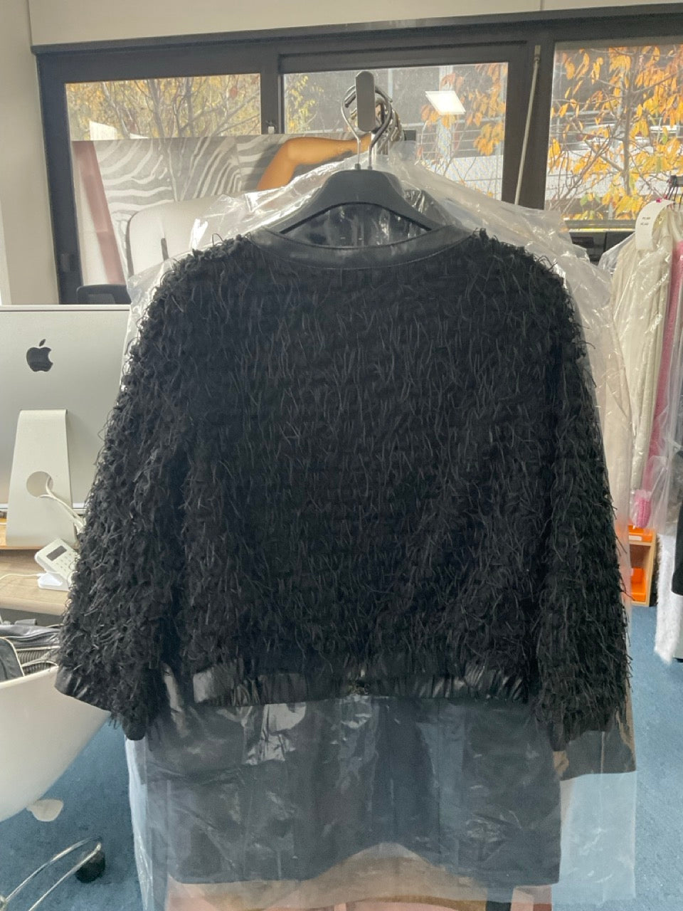 Apportez une touche de sophistication originale à vos tenues avec cette superbe veste seconde main signée GIOA GIOA. Sa matière texturée à effet frangé et sa finition en simili cuir sur l'encolure et la fermeture lui donnent un look unique, chic et contemporain. Facile à assortir, elle s’impose comme une pièce forte de votre dressing d’hiver ou de mi-saison.