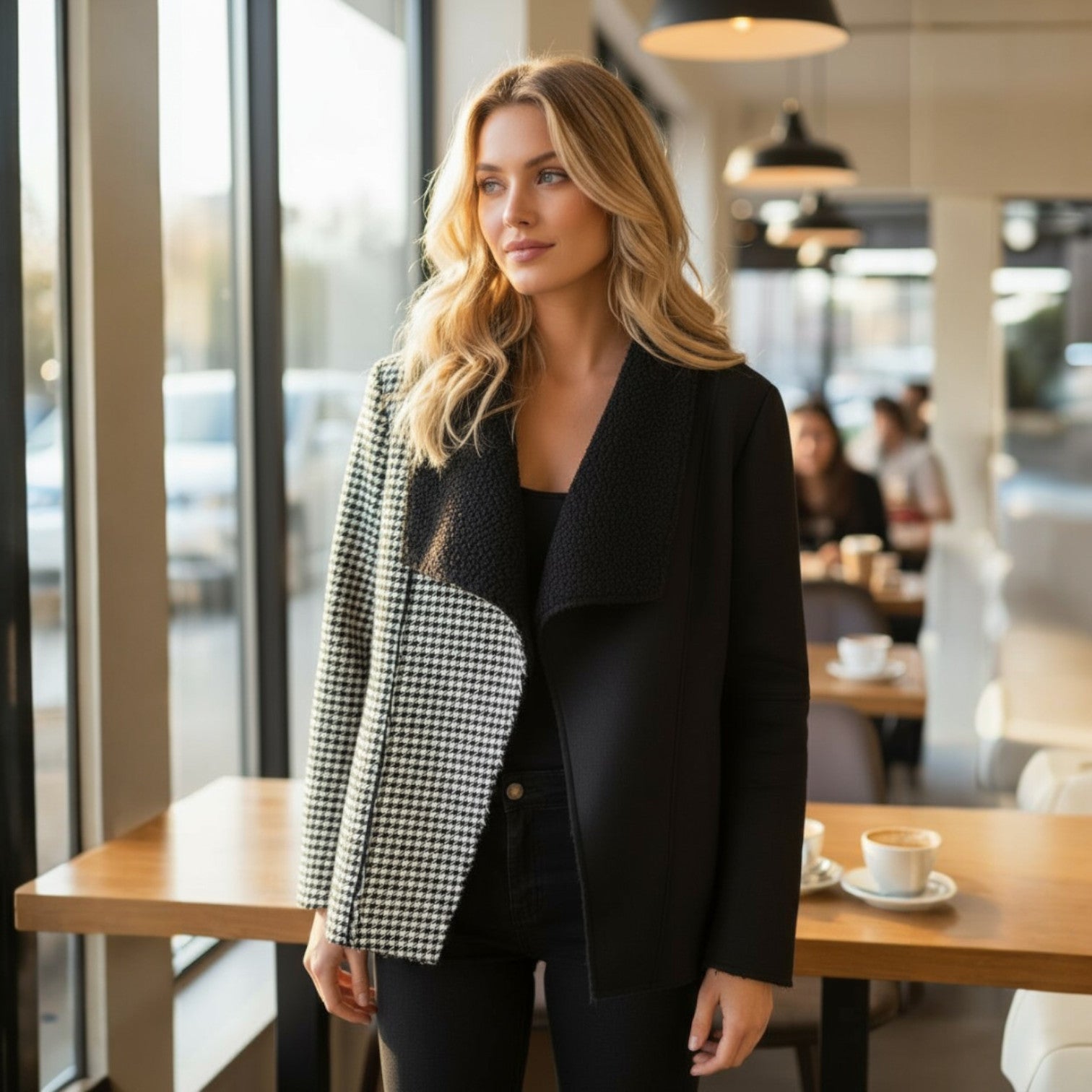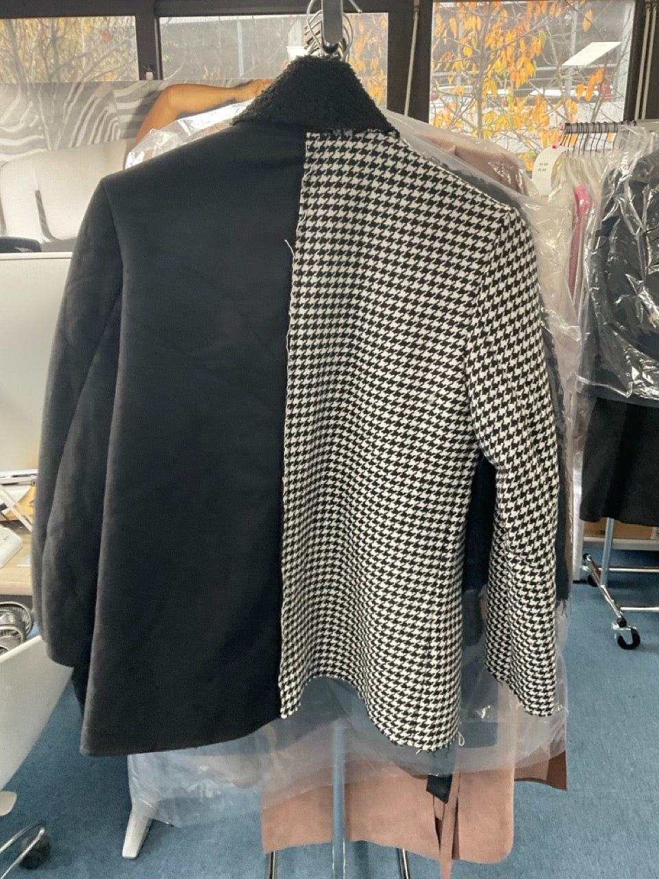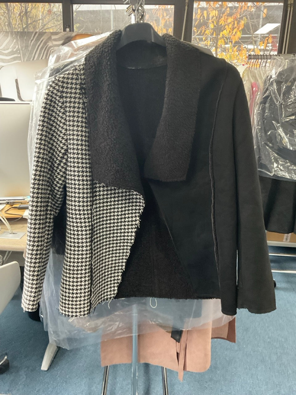 Design asymétrique : une manche et un pan en suédine noire, l'autre en tissu pied-de-poule